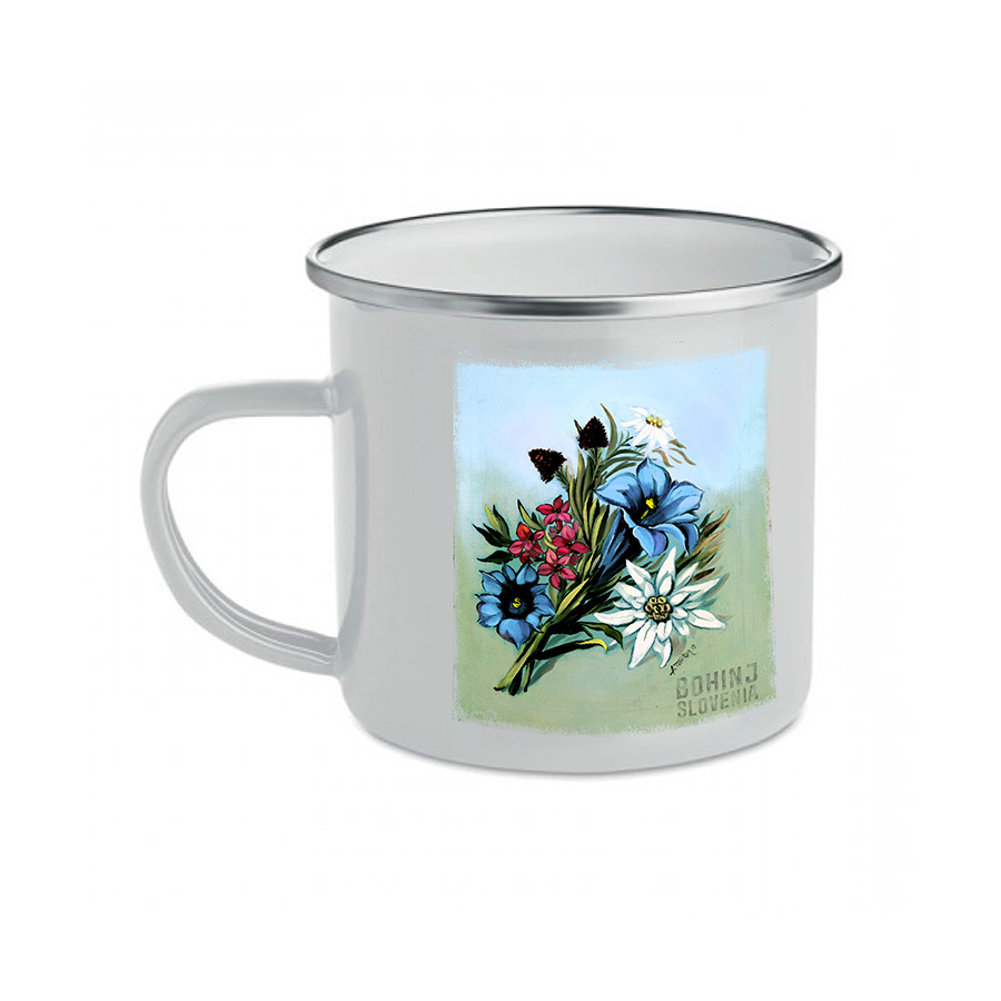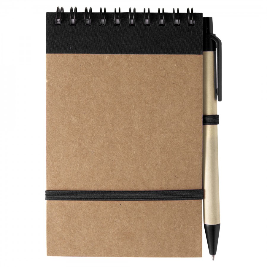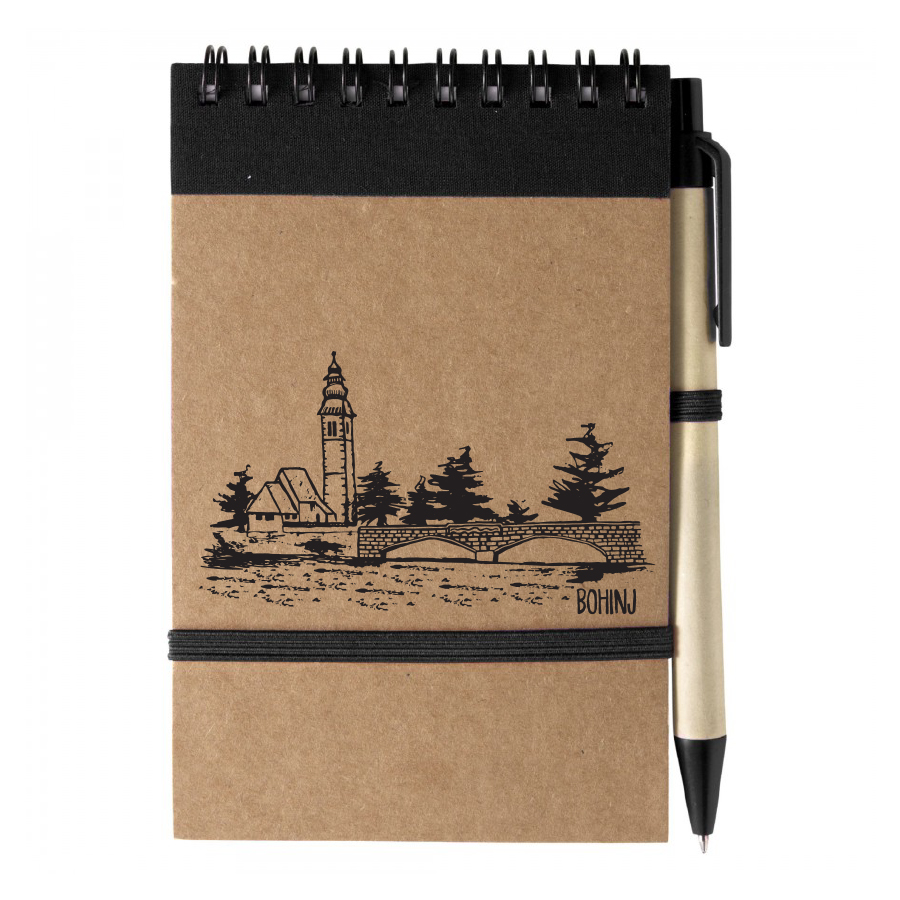 Žepna beležka s 70 brezčrtnimi listi iz recikliranega papirja in kemičnim svinčnikom iz recikliranega kartona in biorazgradljive plastike. Modro črnilo. Potisk: motiv Bohinjskega jezera.