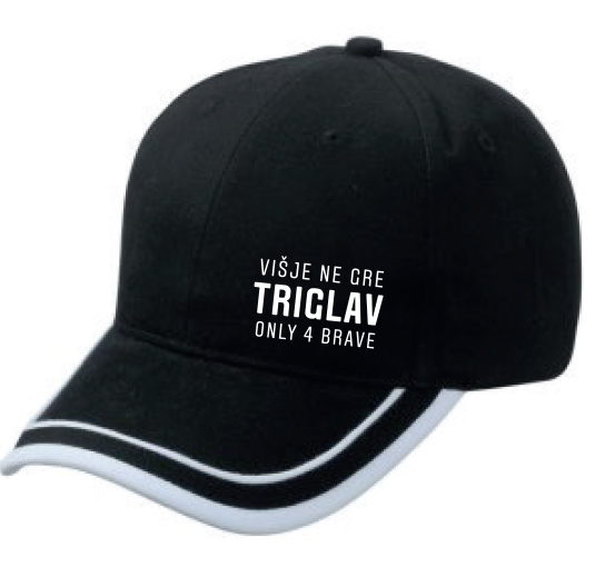 Športna kapa s šiltom iz 100% poliestra, ena velikost. Potisk: motiv Triglav Višje ne gre/Only 4 brave.